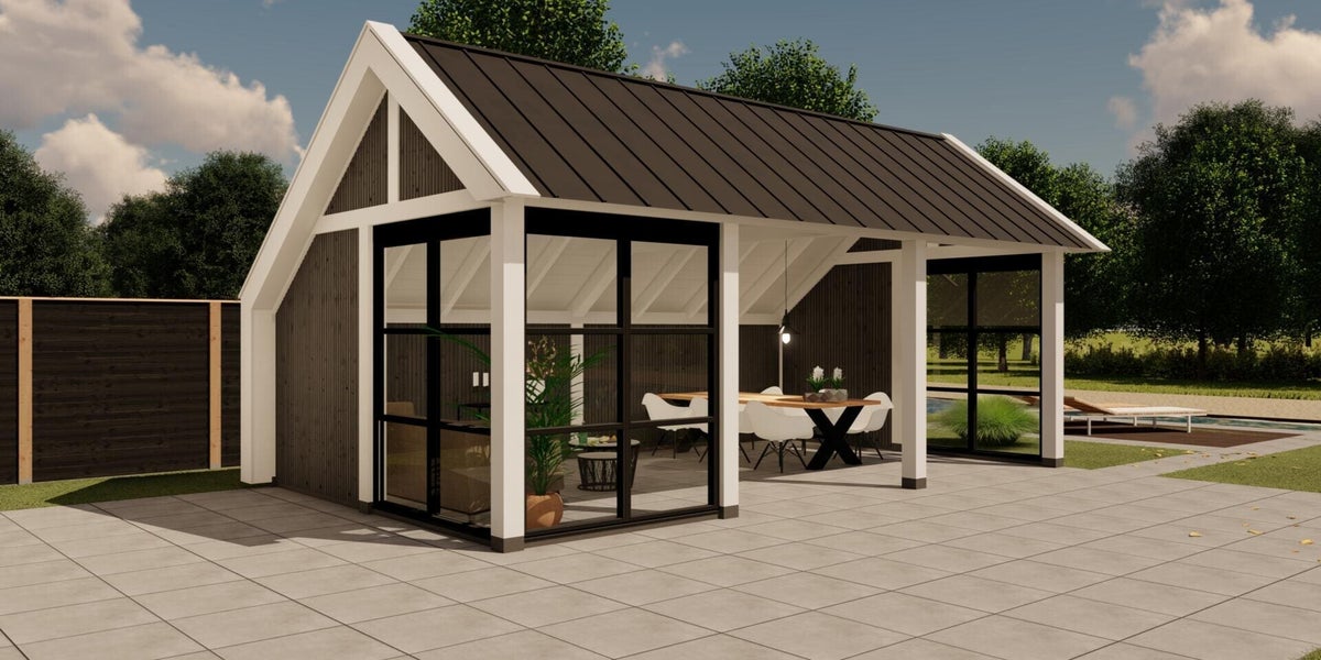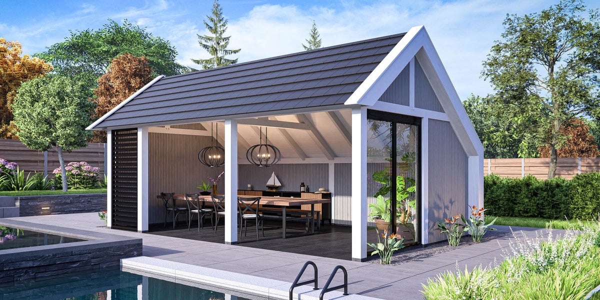 Buitenverblijf Lissabon is een moderne aanvulling voor je tuin of buitenruimte. Ideaal als tuinkantoor, tuinkamer, poolhouse of B&B. Dit buitenverblijf past perfect in zowel landelijke als luxe omgevingen. De strak ontworpen kolommen aan de zijkanten dragen bij aan een elegante en verfijnde uitstraling.